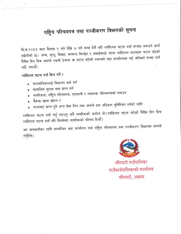 चौरपाटी गाउँपालीकामा नागरिकता प्रदान ,अपाङग परिचय पत्र तथा व्यवसाय दर्ता सम्बन्धि ३ दिने एकिकृत घुम्ती शिविर बस्ने सम्बन्धी सूचना।।।