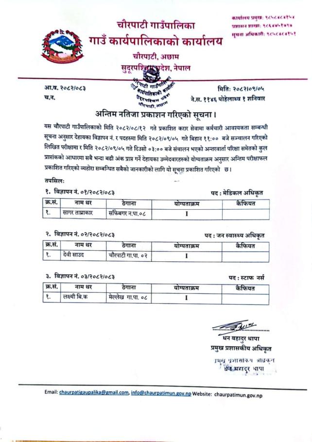 चाैरपाटी गाउँपालिकामा करारमा कर्मचारी व्यवस्थापन परीक्षा सम्बन्धि सूचना