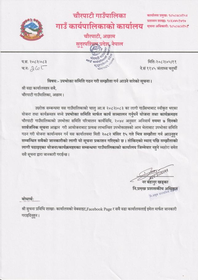 » उपभोक्ता समिति गठन गरि सम्झौता गर्न आउने वारेको सूचना ।