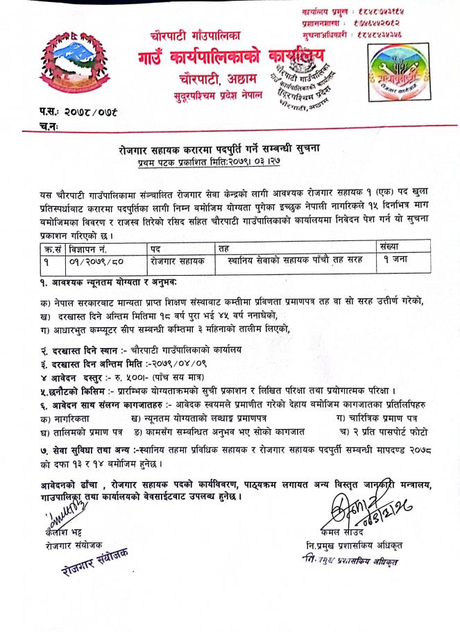 चाैरपाटी गाउँपालिकामा करारमा कर्मचारी व्यवस्थापन परीक्षा सम्बन्धि सूचना